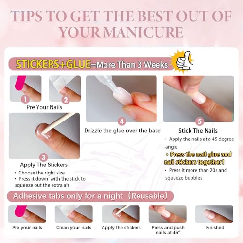 Package Includes: 24 pcs stick on false glue on nails kit, each box includes 24 short square press on nails, 1 sheet of 24 sticky nail pieces, 1 cuticle stick, 1 double sided nail file and gel press on nails cleaning pads, a small tube of nail glue,All the tools you need to apply the nails are included in one set